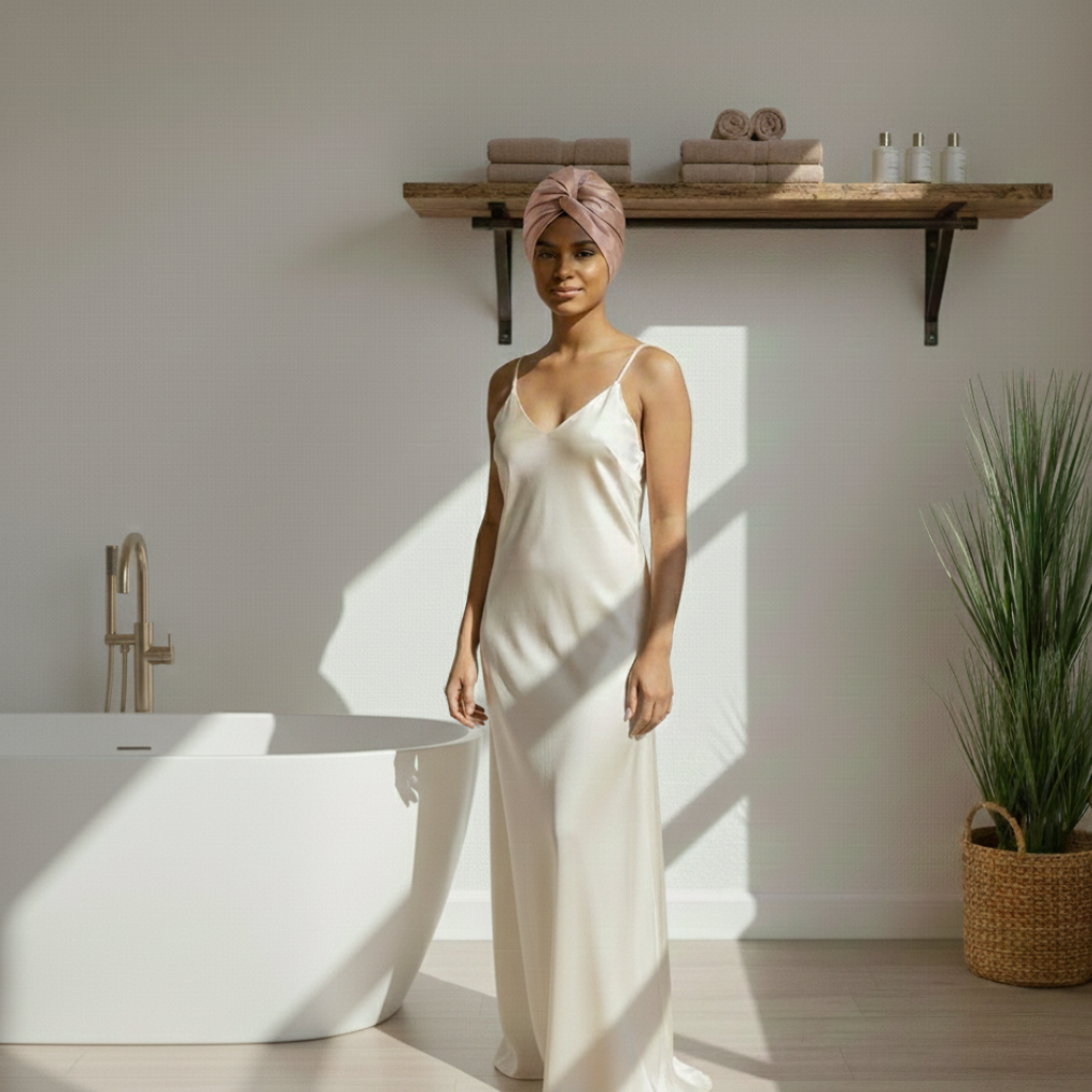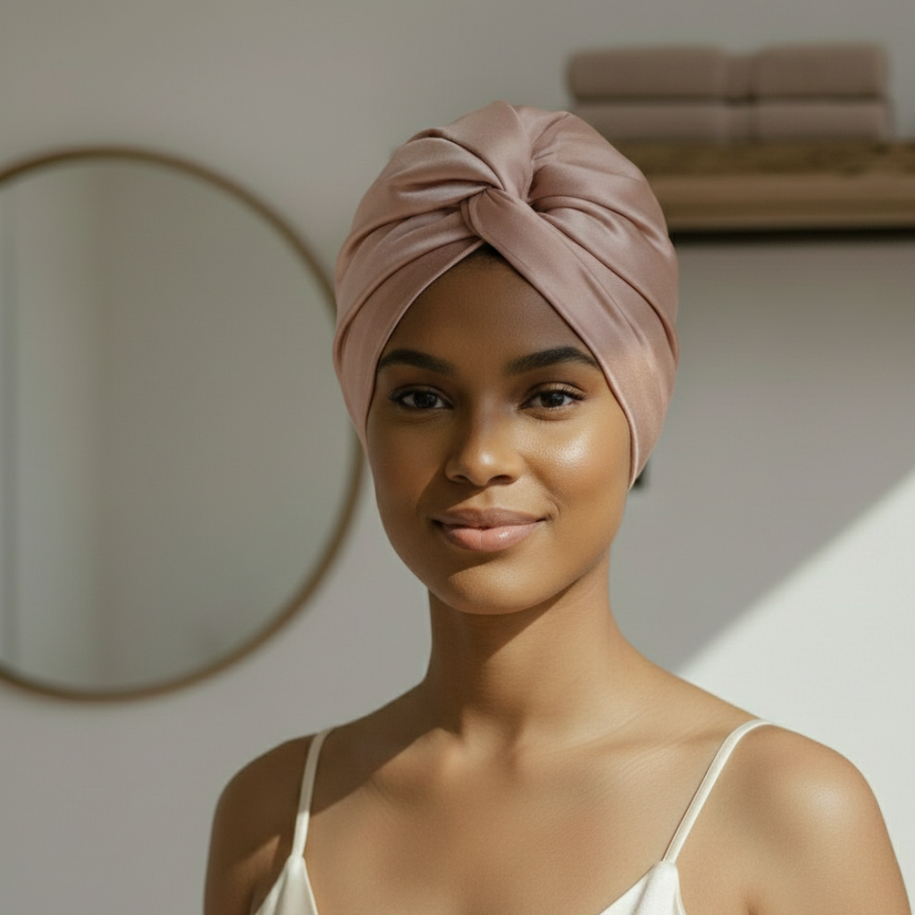 Der Bloom Turban hält Pflege dort, wo sie wirken soll.